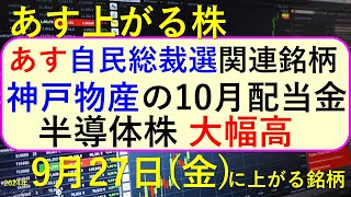 あす上がる株 2024年9月27日(金)に上がる銘柄。自民党総裁選の関連銘柄。