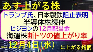 あす上がる株 2024年12月4日(水)に上がる銘柄。トランプ氏、日本製鉄の阻止表明。海運株断トツの値上がり率。