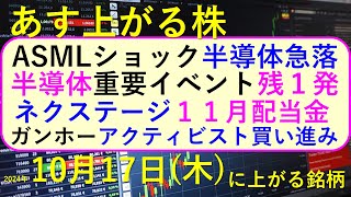 あす上がる株 2024年10月17日(木)に上がる銘柄。ASMLショック