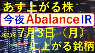 あす上がる株 2023年7月3日(月)に上がる銘柄 ~日本株での株式投資のお話です。AbalanceのIRセミナー。NTT(日本電信電話)の株式分割。最新の