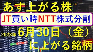 あす上がる株 2023年6月30日(金)に上がる銘柄 ~日本株での株式投資。JT(日本たばこ産業)の配当とJT株の買い時。NTT(日本電信電話)の株式分割。最新の