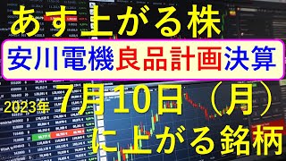あす上がる株 2023年7月10日(月)に上がる銘柄 ~日本株での最新の株式投資のお話です。良品計画と安川電機の決算。最新の
