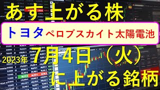 あす上がる株 2023年7月4日(火)に上がる銘柄 ~日本株での株式投資と最新の株式情報のお話です。トヨタ自動車のペロブスカイト型太陽電池と関連銘柄。最新の