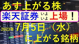あす上がる株 2023年7月5日(水)に上がる銘柄 ~日本株での株式投資と最新の株式情報のお話です。楽天証券が上場。ペロブスカイト型太陽電池と関連銘柄。最新の