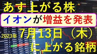 あす上がる株 2023年7月13日(木)に上がる銘柄 ~日本株での最新の株式投資のお話です。イオンが決算で増益を発表。ソシオネクスト株の状況。最新の