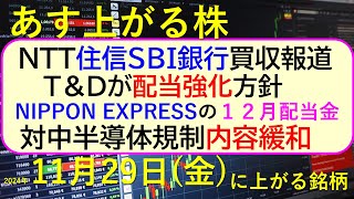 あす上がる株 2024年11月29日(金)に上がる銘柄。NTTドコモが住信SBI銀行買収報道。T&Dが配当強化方針。