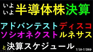 株の決算。ソシオネクスト、アドバンテスト、ルネサスエレクトロニクス、ディスコの4銘柄。日本株の決算発表スケジュール2週間分(7/18-7/28分)あす上がる株。
