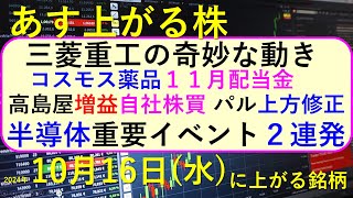 あす上がる株 2024年10月16日(水)に上がる銘柄。