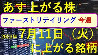 あす上がる株 2023年7月11日(火)に上がる銘柄 ~日本株での最新の株式投資のお話です。ファーストリテイリングは今週が決算。最新の