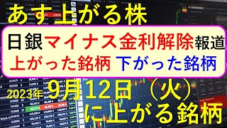 あす上がる株 2023年9月12日(火)に上がる銘柄 ~最新の日本株での株式投資のお話です。初心者でも!