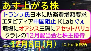 あす上がる株 2025年12月8日(月)に上がる銘柄。トランプ氏日本に防衛費増額要求。KLab増資。堀場にオアシス、三陽にアセットバリュ。クラレの配当~最新の日本株情報。高配当株の株価やデイトレ情報~