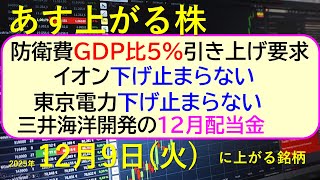 あす上がる株 2025年12月9日(火)に上がる銘柄。防衛費GDP比5%引き上げ要求。イオン下げ止まらない。東京電力下げ止まらない。三井海洋開発の配当~最新の日本株情報。高配当株の株価やデイトレ情報~