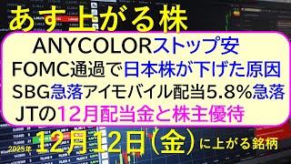 あす上がる株 2025年12月12日(金)に上がる銘柄。ANYCOLORストップ安。FOMC通過で日本株の下げ原因。ソフトバンクグループ急落。JT配当~最新の日本株情報。高配当株の株価やデイトレ情報~