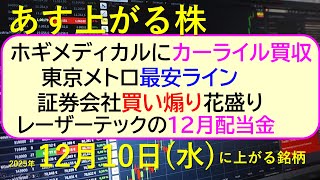 あす上がる株 2025年12月10日(水)に上がる銘柄。ホギメディカルカーライル買収。東京メトロ最安ライン。証券会社買い煽り花盛り。レーザーテック配当~最新の日本株情報。高配当株の株価やデイトレ情報~