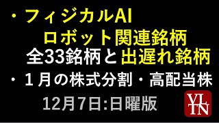 フィジカルAI・ロボット関連銘柄、全33銘柄と出遅れ銘柄。1月の株式分割と高配当株。決算スケジュール2週間分。12月7日(日)~あす上がる株。最新の日本株情報~