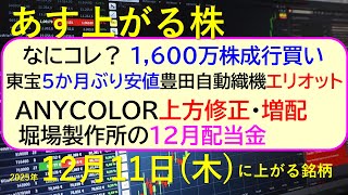 あす上がる株 2025年12月11日(木)に上がる銘柄。ANYCOLOR上方修正・増配。豊田自動織機にエリオット。東宝5か月ぶりの安値。堀場製作所配当~最新の日本株情報。高配当株の株価やデイトレ情報~