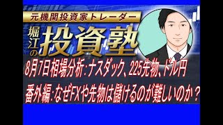 8月7日相場分析:ナスダック、225先物、ドル円 番外編:なぜFXや先物は儲けるのが難しいのか?