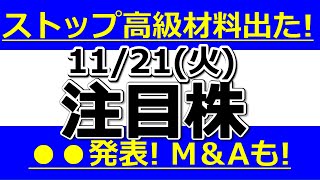 ストップ高濃厚級特大材料出た!【11月21日(火)の注目株】明日のストップ高候補株・株式投資の参考に