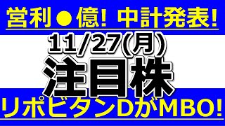 営利●億へ中計発表!リポビタンDがMBOも!【11月27日(月)の注目株】明日のストップ高候補株・株式投資の参考に