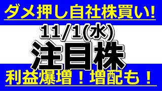 ダメ押し自社株買い!利益爆増!増配も!【11月1日(水)の注目株】明日のストップ高候補株・株式投資の参考に