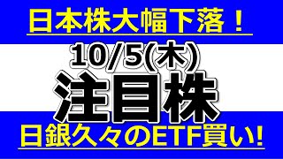 日本株大幅下落!日銀が久々のETF買い【10月5日(木)の注目株】明日のストップ高候補株・株式投資の参考に