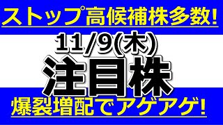 ストップ高候補株多数!爆裂増配でアゲアゲクル~!【11月9日(木)の注目株】明日のストップ高候補株・株式投資の参考に