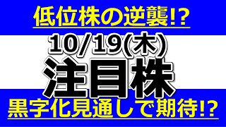 低位株の逆襲!?黒字化で明日はストップ高!?【10月19日(木)の注目株】明日のストップ高候補株・株式投資の参考に