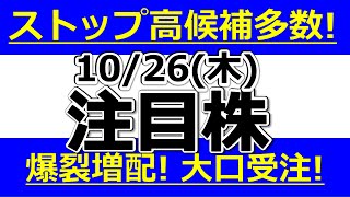 ストップ高候補多数!爆裂増配! 大口受注!【10月26日(木)の注目株】明日のストップ高候補株・株式投資の参考に