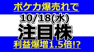 ポケカ爆売れで利益爆増1.5倍!?【10月18日(水)の注目株】明日のストップ高候補株・株式投資の参考に