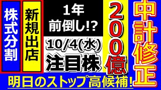 中計を1年前倒し!?【10月4日(水)の注目株】明日のストップ高候補株・株式投資の参考に