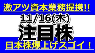 激アツ資本業務提携!!日本株爆上げスゴイ!【11月16日(木)の注目株】明日のストップ高候補株・株式投資の参考に