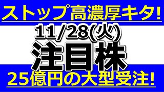 ストップ高濃厚キタ!25億円の大型受注!【11月28日(火)の注目株】明日のストップ高候補株・株式投資の参考に