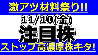 激アツ材料祭り!!ストップ高濃厚株キタキタ!【11月10日(金)の注目株】明日のストップ高候補株・株式投資の参考に
