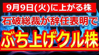 【石破総裁が辞任発表で、高市関連株と小泉進次郎関連株がブチアゲしそう!】9/9(火)に株価が上がる株/明日上がる株/バーゲン株/株式投資日本株最新情報