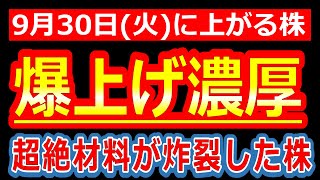【オメデトウ!拍手喝采!超絶材料が炸裂して明日はお祭り騒ぎ濃厚な株!】9/30(火)に株価が上がる株・明日上がる株・来週上がる株・株式投資日本株最新情報