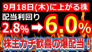 【見逃せない!エグイ大増配発表!配当性向50%へ大幅引き上げサプライズ!】9/18(木)に株価が上がる株・明日上がる株・高配当株速報・株式投資日本株最新情報