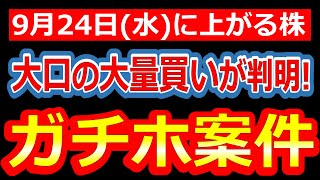 【見なきゃ損!大口の大量買いが判明!この激アツ銘柄は超注目!】9/24(水)に株価が上がる株・明日上がる株・来週上がる株・株式投資日本株最新情報