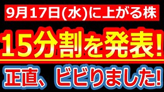 【まさかの株式15分割で大注目確定の株!】9/17(水)に株価が上がる株・明日上がる株・来週上がる株・株式投資日本株最新情報
