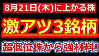 超低位株3銘柄から強材料でた!!短期値幅が狙えそうな株!!【8/21(木)に株価が上がる株・明日上がる株・来週上がる株・株式投資日本株最新情報】