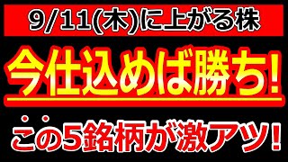 【今仕込みたい激アツ5銘柄!大化けしそうな株や誰もが知ってる企業との提携を発表した株など】9/11(木)に株価が上がる株/明日上がる株/バーゲン株/株式投資日本株最新情報