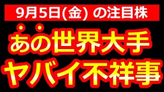 【あの世界大手が、ヤバイ不祥事で暴落開始!】9/5(金)に株価が上がる株・明日上がる株・来週上がる株・株式投資日本株最新情報