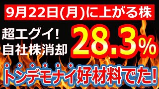 【トンデモナイ好材料でた!超エグイ自社株消却28.3%】9/22(月)に株価が上がる株・明日上がる株・来週上がる株・株式投資日本株最新情報