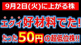 【たった50円の超低位爆安株にエグイ好材料でた!】9/2(月)に株価が上がる株・明日上がる株・来週上がる株・株式投資日本株最新情報