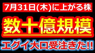 【数十億円規模のエグイ大口受注を発表した株!!】7/31(木)に株価が上がる株・明日上がる株・来週上がる株・株式投資日本株最新情報