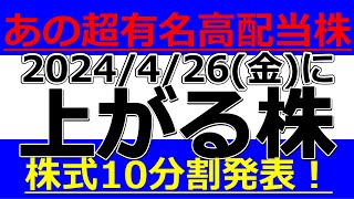 2024/4/26(金)に株価が上がる株、株式投資・デイトレの参考に。あの超有名高配当株が株式10分割&株主優待新設