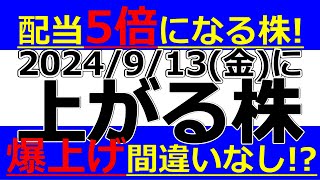 2024/9/13(金)に株価が上がる株、株式投資・デイトレの参考に。配当5倍になる株!爆上げ間違いなし!?
