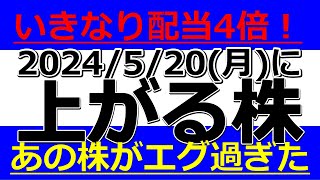 2024/5/20(月)に株価が上がる株、株式投資・デイトレの参考に。いきなり配当4倍!あの株がエグ過ぎた!