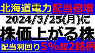 2024/3/25(月)に株価が上がる株、株式投資・デイトレの参考に。北海道電力上方修正&増配、丸八証券と岩井コスモ大増配で配当利回り5%、レントラックス、FPG、 京急電鉄、 アイザワ証券、セルシス