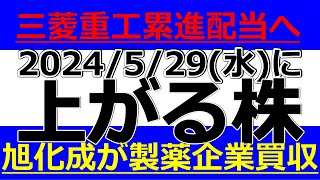 2024/5/29(水)に株価が上がる株、株式投資・デイトレの参考に。三菱重工累進配当導入へ!旭化成がスウェーデン製薬企業買収