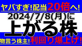 2024/7/8(月)に株価が上がる株、株式投資・デイトレの参考に。ヤバすぎ!配当20倍へ!物言う株主で利回り爆上げキター!